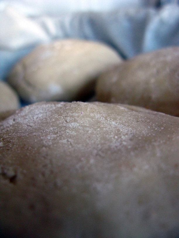 Transfer the dough to a floured surface and cut into six equal pieces. Line a sheet pan with baking paper and lightly oil it. Sprinkle a bit of flour on the dough and gently shape them into balls.