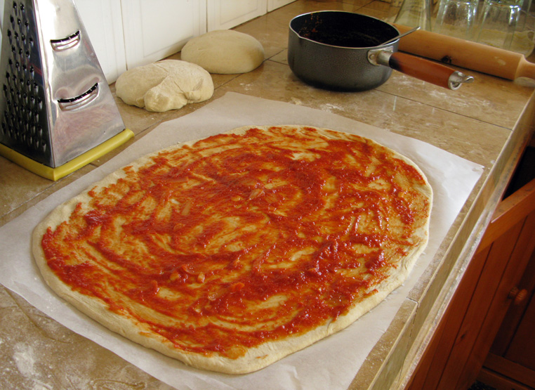 lay it on the pizza peel,pan or straight on baking paper and top lightly with your favorite sauces, cheeses, veggies and meats.