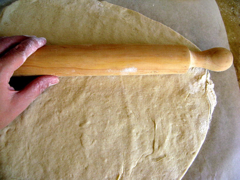 I usually shape the dough with a rolling pin or a big bottle but if you feel like trying the Italian way. Deep your hand into flour and give it a try…