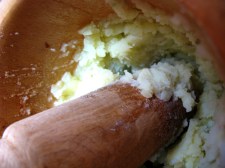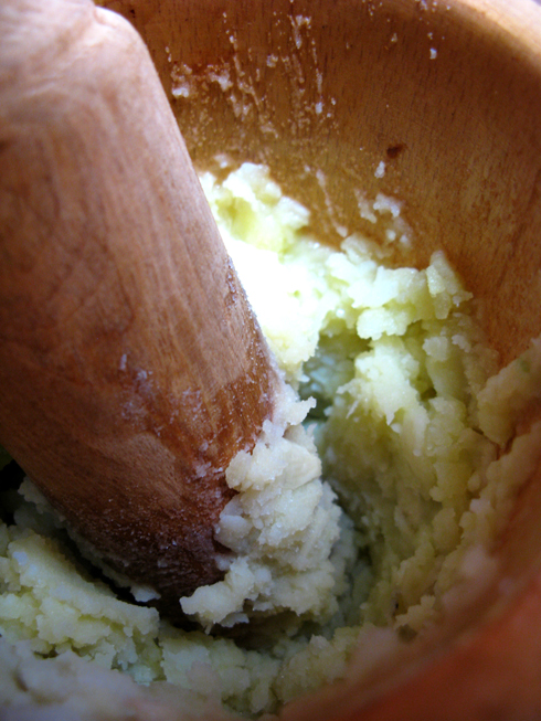 Remove the skin from potatoes and add in the mortar. You can transfer the mix in a bowl if there is not enough space in the mortar and continue blending the mix until smooth. Keep adding olive oil while blending the ingredients. The olive oil should be totally absorbed by the potatoes.