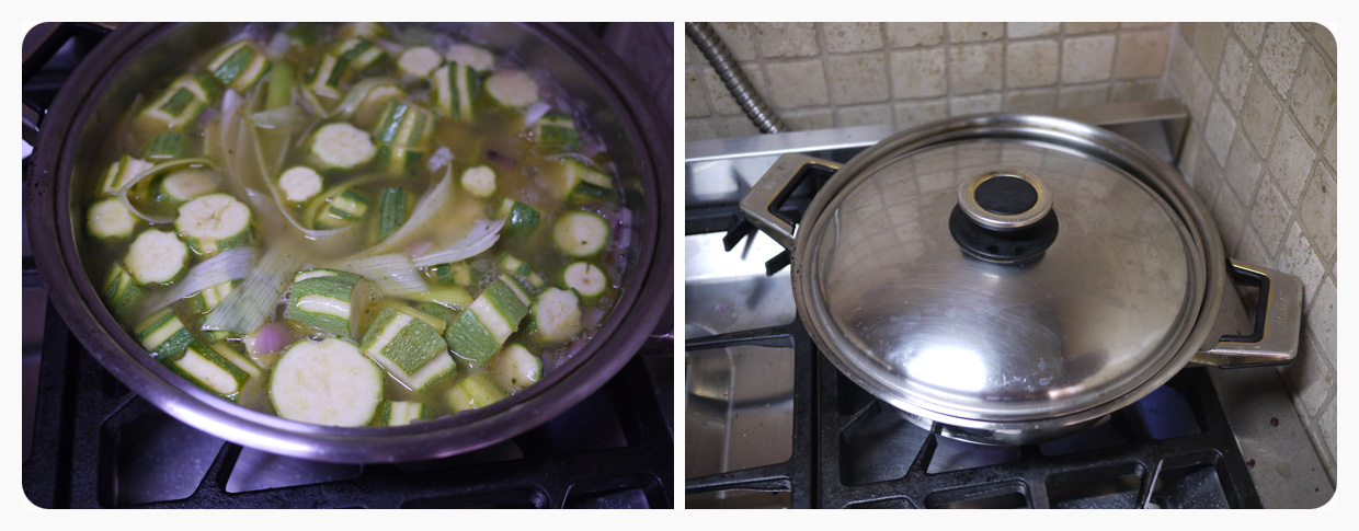 Add the vegetable broth to the vegetables, salt to your taste, partially cover with a lid and boil for 15 minutes or until your zucchinis turn soft. You can test with a fork the tenderness.