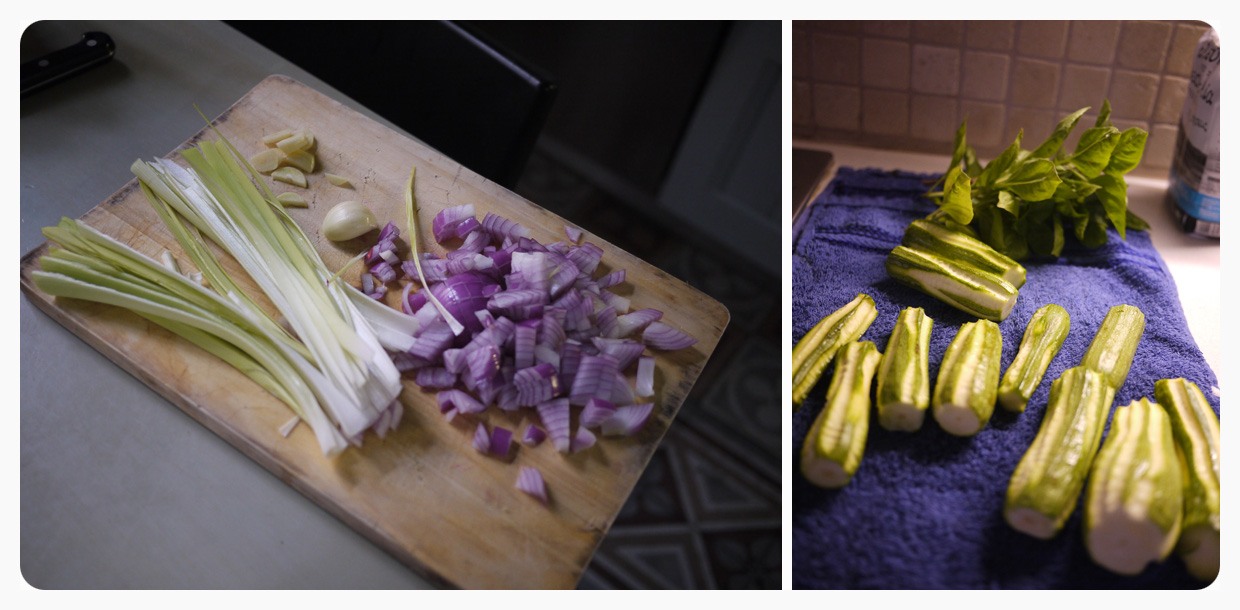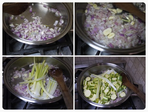 Drizzle some olive oil in a heavy bottom pan and saute the onions  in medium heat until they get translucent and soft. Add the garlic then the leek and finally the zucchinis. Keep stirring the vegetables and take care for the onion and garlic not to get burn, if need you may add a few additional drops of olive oil.