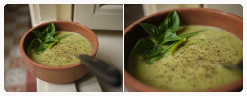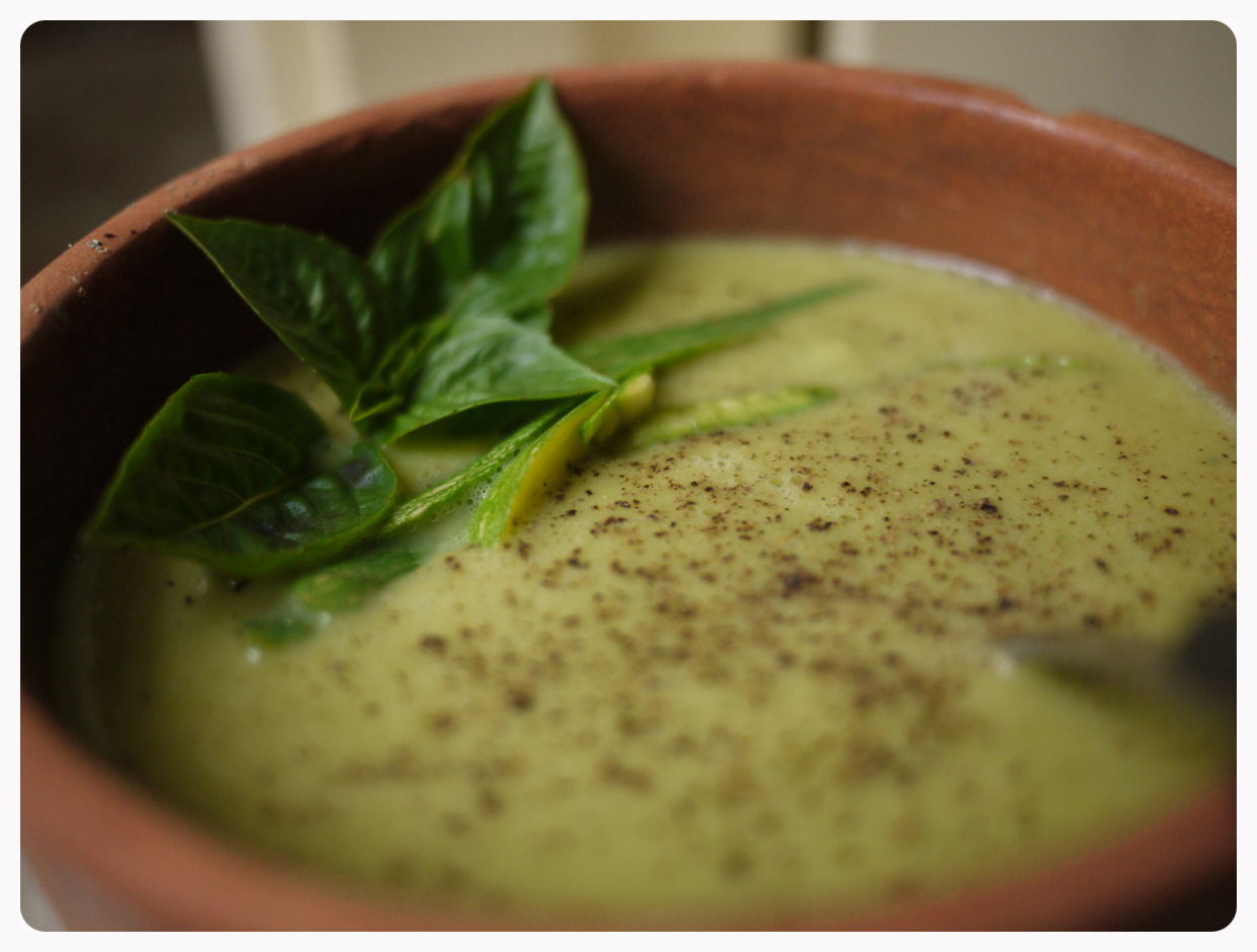 When you serve the hot soup add freshly grounded pepper, some basil leaves and some tenderized zucchini skin stripes.